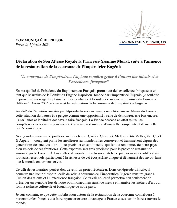 Pour l’anthropologue Marc Augé : « Le patrimoine est ce qui permet à une société de se reconnaître dans la durée. Lorsqu’il est menacé, c’est le rapport au temps lui-même qui vacille ». C’est dans cet esprit que la princesse Yasmine Murat, engagée depuis plusieurs années dans la promotion du patrimoine et de l’excellence française, a pris la parole. En sa qualité de présidente du Rayonnement Français et de marraine de la Fondation Eugène Napoléon — institution créée par l’impératrice elle-même — elle a tenu à délivrer un message résolument tourné vers l’avenir. « Au-delà de l’émotion suscitée par l’épisode du vol des joyaux napoléoniens au Musée du Louvre, cette situation doit aussi être perçue comme une opportunité : celle de démontrer, une fois encore, l’excellence et la vitalité des savoir-faire français. », a déclaré l’épouse du prince Joachim Murat.