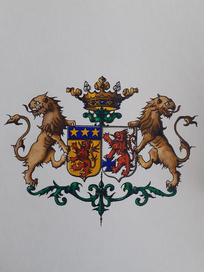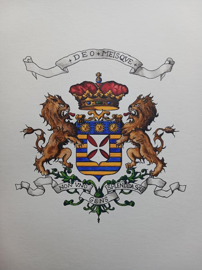 Je dirais tout simplement les armoiries de ma famille que j’ai commencé à dessiner au crayon puis à varier les techniques : gouaches, aquarelle…Le virus était passé : je me suis intéressé aux armes d’autres familles, toujours en les dessinant. C’est d’ailleurs émouvant pour moi de voir ces dessins anciens, témoins d’une passion qui ne m’a jamais plus quitté.